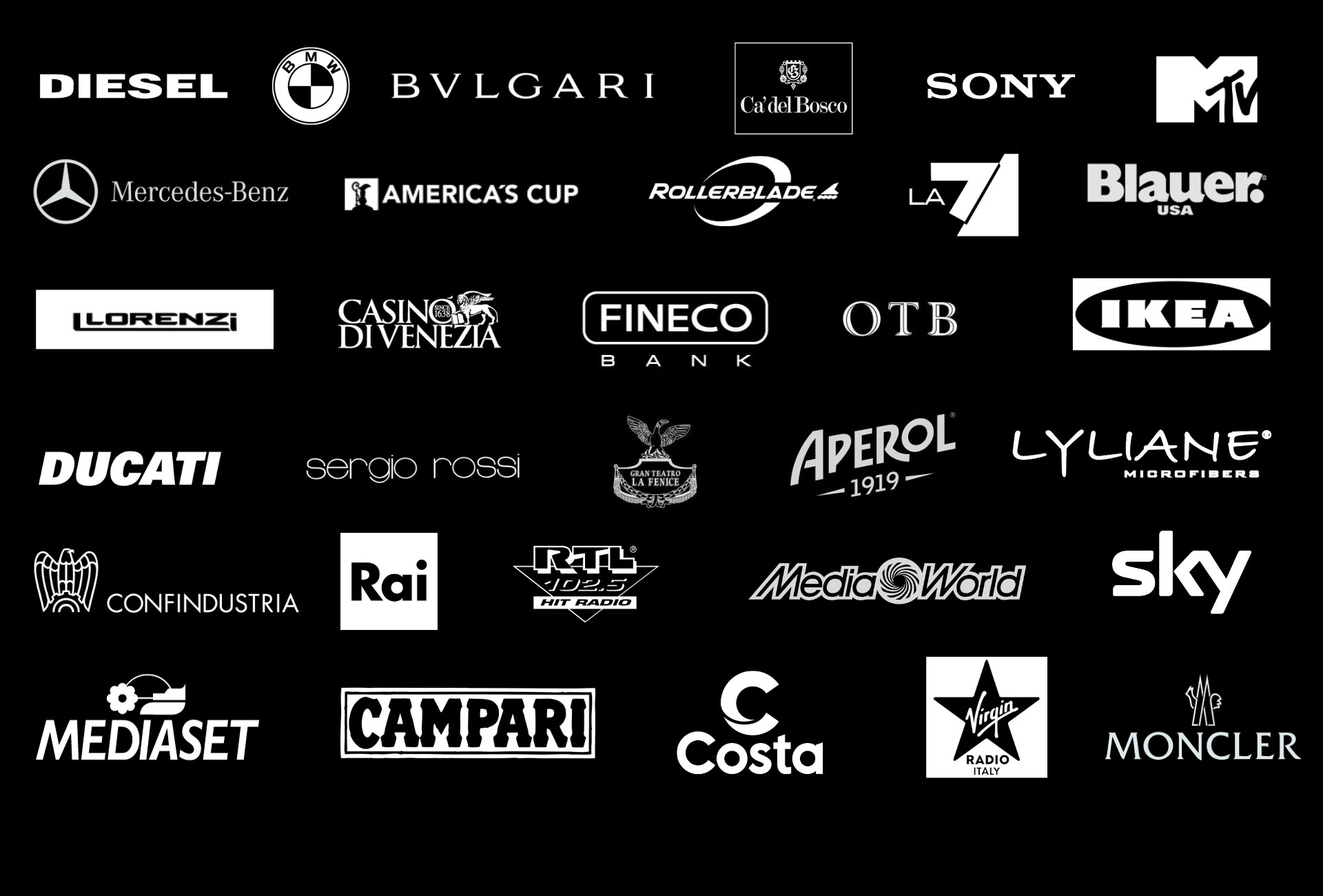 Diesel, BMW, Bulgari, Ca’ del Bosco, Sony, MTV, Mercedes-Benz, America’s Cup, Rollerblade, La7, Blauer, Lorenzi, Casinò di Venezia, Fineco, OTB, IKEA, DUCATI, Sergio Rossi, Gran Teatro La Fenice, Aperol, Lyliane, Confindustria, RAI, RTL, MediaWorld, SKY, Mediaset, Campari, Costa, Virgin, Moncler